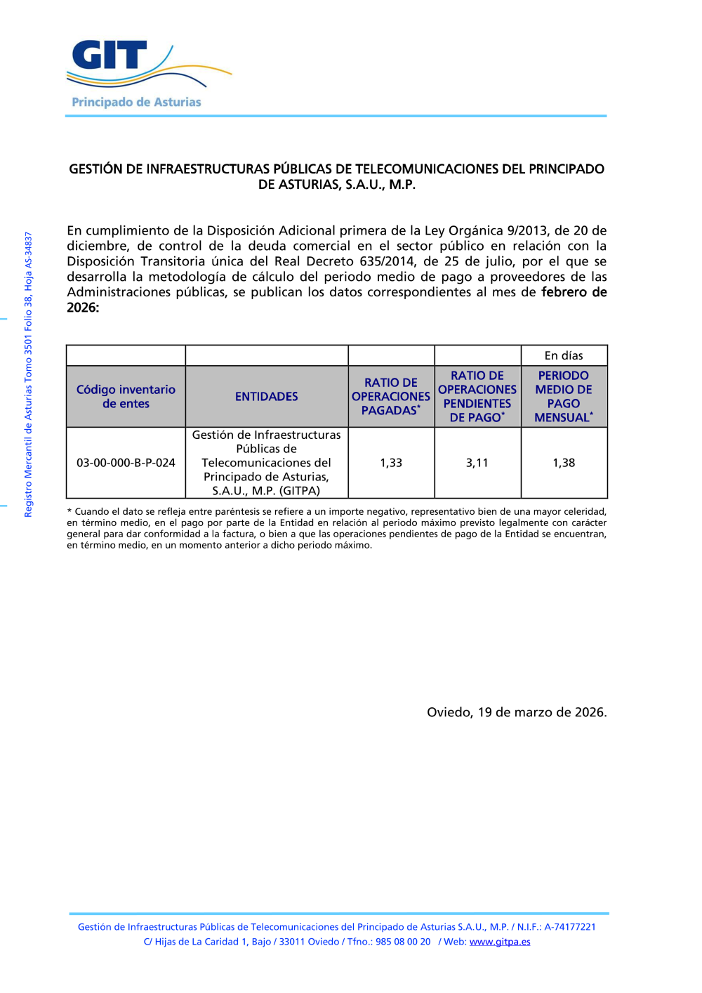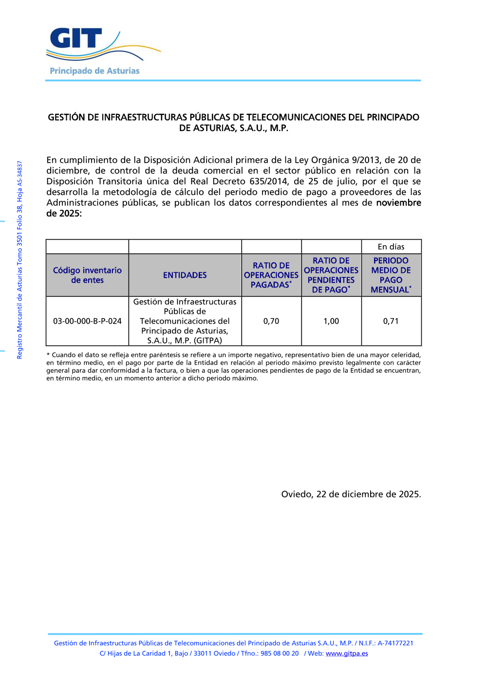 Conforme a lo establecido en el artículo 8 apartado D) de la Ley del Principado de Asturias 8/2018, de 14 de septiembre, de Transparencia, Buen Gobierno y Grupos de Interés, se publica el plazo medio de pago a proveedores con periodicidad mensual.